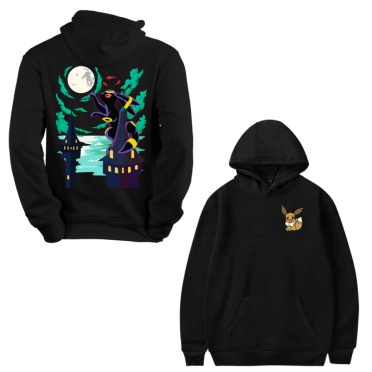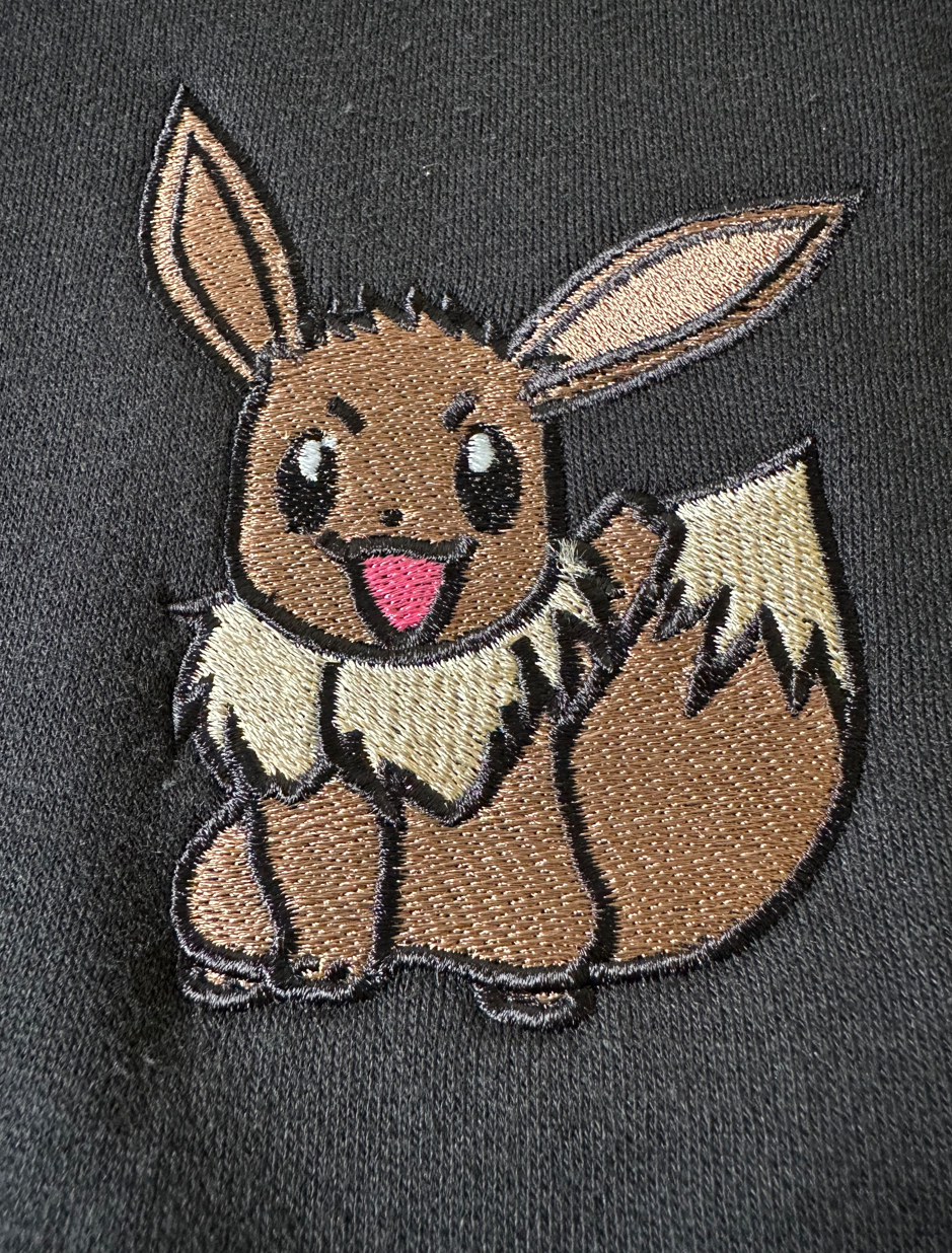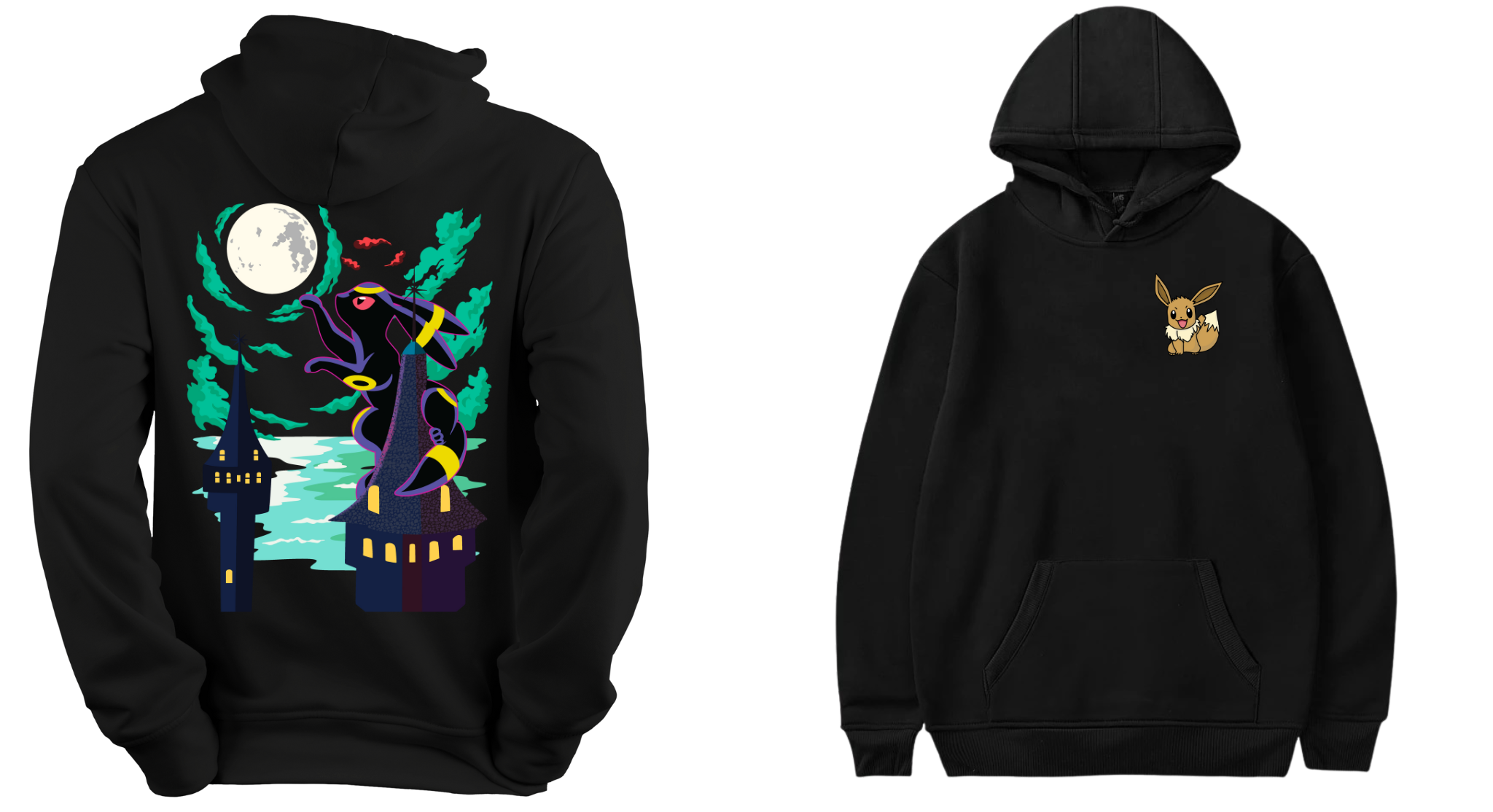 Ultra-soft pullover hoodie. The Eevee image is embroidered into the hoodie so that it won’t fade, peel or wash off. The back image of the Moonbreon is printed. For all hoodies it’s recommended you go one size higher than you usually are to have that extra room.